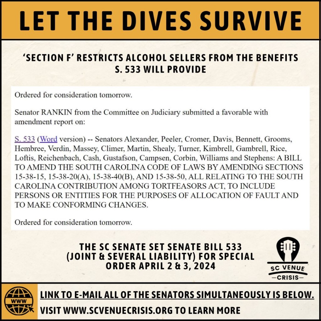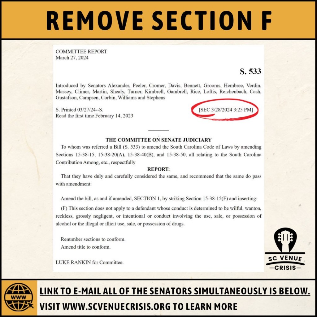 Section F removes alcohol sellers from the benefits of S. 533. Every locally owned bar, music venue, brewery, distillery, winery, pool hall, bowling alley, and any other establishment with a South Carolina liquor license will not be protected by the bill.