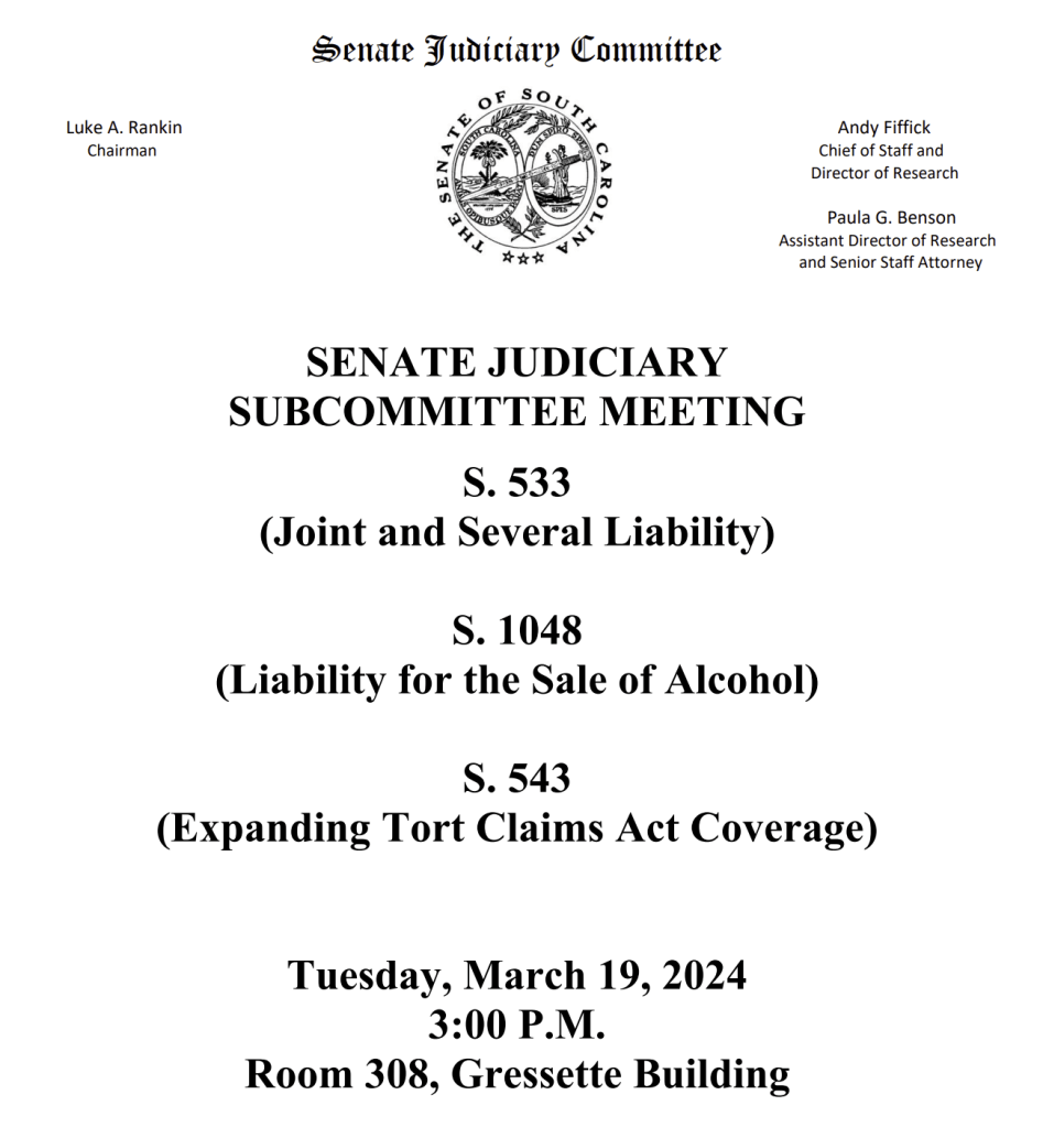 The Senate Judiciary Committee has a meeting scheduled for 3:00 pm on Tuesday, March 19 in Room 308 in the Gressette Building. Watch the live stream to find out what they’re planning for the following bills: