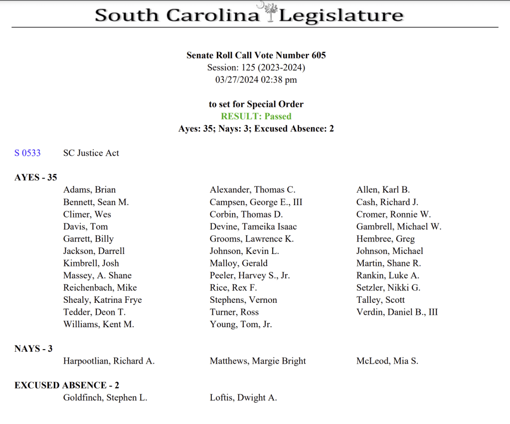 Yesterday, the SC Senate voted to set for special order S. 533, the SC Justice Act, which will add the bill to the top of today’s calendar for discussion. According to the The Senate calendar, the next session begins at 11:00 am, today. However, according to the SC Legislature video schedule, the next meeting date is Tuesday, April 2, 2024 at 12:00 pm. We will let you know when we have new information.