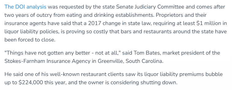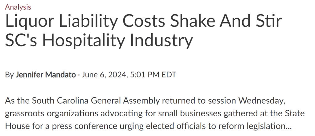 “This is a call to action,” said South Carolina House of Representative Jason Elliot (R). “Businesses all over South Carolina are closing because of unaffordable alcohol liability insurance.”